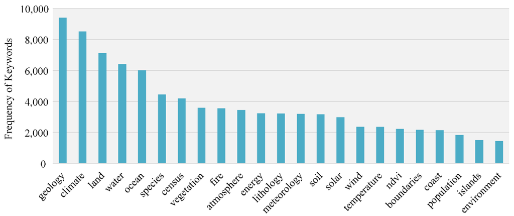 Investigating the map subject matter of global WMSs can benefit global cross-disciplinary users in discovering and selecting map resources, as well as increasing our understanding of open data sharing policies, public issues, and trends in the Earth sciences and other disciplines. Although the languages used to describe WMS metadata vary (e.g., English, German, French, Dutch, Italian, Norwegian, Swedish and Chinese), according to our investigation, around 87.85% of the valid WMSs (36,638) contained English words in their service descriptions, and 82.57% of the layers contained keyword fields that were described in English. Subsequently, we studied the top map layer subjects based purely on English keyword to reduce the complexity of data analysis. We extracted a group of English keywords for each map layer from layer description fields (e.g., title, abstract, keywords) of capability documents. The stop words, replicated words and words that were not nouns were eliminated during extraction. Then, we calculated and sorted the occurrence frequency of keywords among all map layers. Figure 8 shows the top English language keywords that had the highest word frequencies. According to the GEOSS Societal Benefit Areas (SBAs) [65] and INSPIRE directive [63], we analyzed obtained keywords and found that the following subjects related to the natural environment and resources appear most frequently: geology, climate, energy, land cover, water, biodiversity, agriculture and ecosystem. Given the explosive growth in Earth observation technologies over past several decades, governments, academic institutions and non-profit organizations have collected and processed a large amount of geographic data about natural phenomena. Many of the data were published using standard OGC services and form the majority of open map resources. For example, the INSPIRE directive is primarily oriented to share spatial environmental information among public sector providers [63].