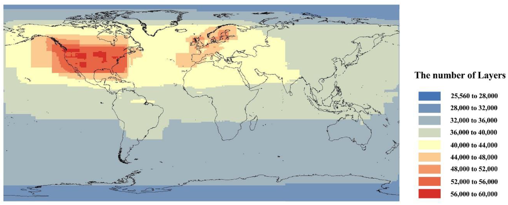 By analyzing the geographic extent (i.e., bounding box) of 318,102 map layers (Figure 9), we found that continents are covered more intensively than the oceans, except for Antarctica, and the Northern Hemisphere has more coverage than the Southern Hemisphere. Many of the layers have a global extent (more than 25,000 layers). This phenomenon reveals our global Earth observation behaviors and also reflects human activities in space, to some degree. The differences in the richness in open geospatial data also reflect the differences in data sharing policies at the country and regional levels. More specifically, spatial coverages of map layers are concentrated in North America and Europe, especially over the mainland of U.S. and Europe, and Northern Africa has the second largest number of coverages, after North America and Europe. However, due to information security and data policy issues, geospatial resources are strictly controlled in some countries. Geospatial data are often shared internally and between governmental agencies through hardcopy or secured private networks rather than by publishing them through standardized web services for public use.