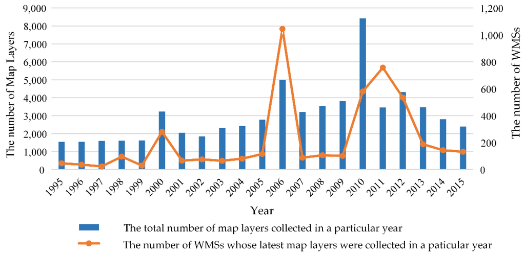 Figure 10 illustrates that the significant increase in WMSs and map layers in 2000 and 2006 was strongly associated with the release of the WMS standards Version 1.0.0 and Version 1.3.0, respectively. The release of the ESRI RESTful Service APIs and successive updates, which are compliant with the WMS standard, caused another significant increase, starting in 2010. Moreover, INSPIRE required member states to provide discovery and view services (i.e., WMS and WMTS) in 2011 at the latest, which may also have promoted the deployment and updating of WMSs. These trends reveal that new technologies, standards and software products are adopted relatively rapidly in the geoinformation domain. However, the enthusiasm for exploring new technologies is hard to maintain when it comes to routine service maintenance. Many of the existing WMSs seldom add new layers or update layer metadata after deployment. Thus, the data collection time for the latest layers in 4124 WMSs among the 4587 WMSs studied (89.91%) is earlier than the year 2013. This may affect the quality of map resources found in online WMSs.