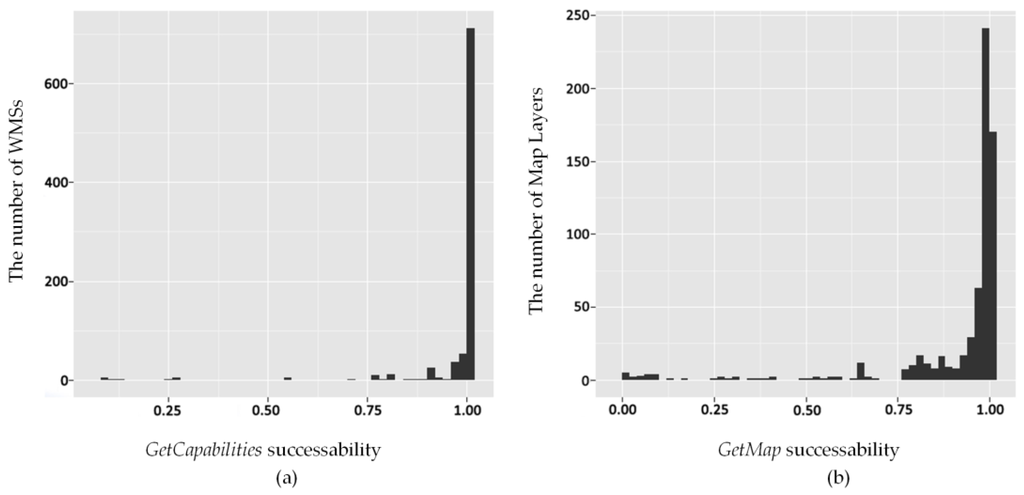 Successability histograms of the two mandatory operations for valid WMSs: (a) GetCapabilities; (b) GetMap.