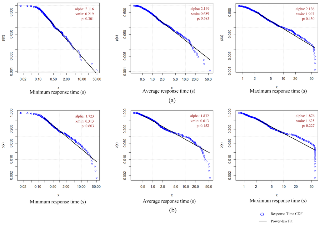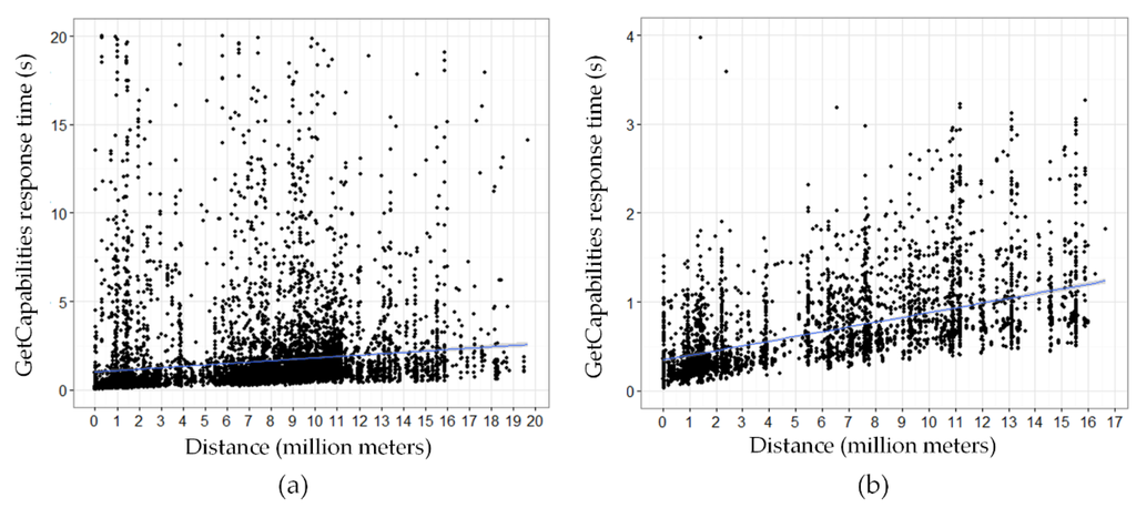 Correlation between response times and spatial distance from monitoring sites to WMS servers. (a) The 876 valid WMSs and (b) the selected 393 WMSs located in the U.S. whose capabilities documents were less than 1 MB with average response times less than two seconds.