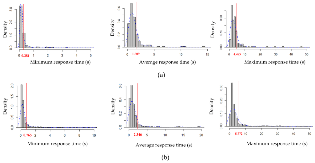 Response time, maximum throughput and computing resource occupation are three common measurement of performance. In our research, we selected response time as the performance measurement because testing maximum throughput requires intensive concurrent requests and may result in request rejection by service providers, while computing resource occupation measurements are hard to obtain. We investigated the overall trends in the response times of all tested WMSs by analyzing the minimum, average and maximum response times of the two mandatory operations recorded for each valid WMS among all successful responses from all monitoring sites. Figure 12 indicates that the response time of the two mandatory operations for valid WMSs, in general, must obey power laws. Most WMSs respond rapidly, but a few have very long response times. The numerical differences between the minimum and the maximum response times are illustrated in Figure 13 reflecting instability in WMS performance. The vertical red lines in the bar charts for average response times indicate that a majority of valid WMSs (more than 80%) can respond to user requests within three seconds in most cases. In contrast, our previous investigations show that less than 40% of WMS GetCapabilities and GetMap operations responded within eight seconds [48,49]. Thus, the overall response time of WMSs was significantly reduced, reflecting improvement in WMSs software and hardware environments, as well as upgrades in the global network, to some extent.