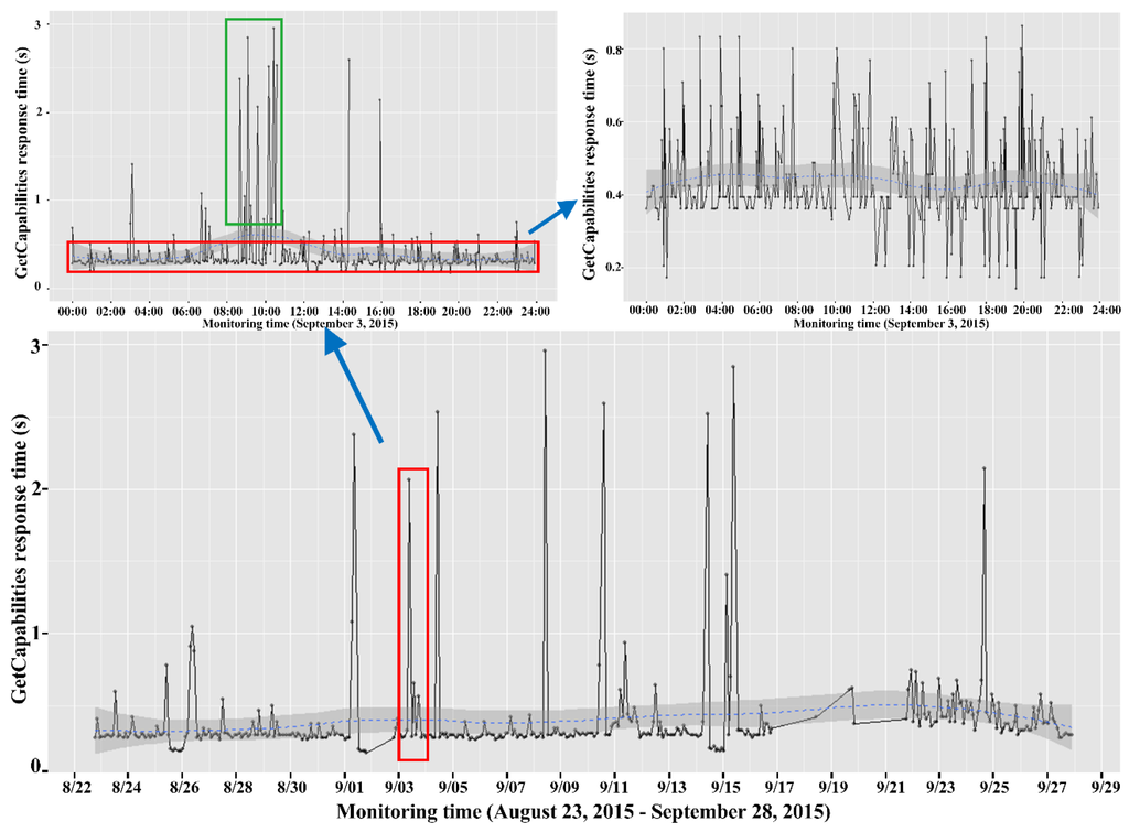 Although geospatial web service monitoring and analysis have yielded abundant outcomes, the following issues still need to be addressed. (1) Sophisticated monitoring strategies are needed to capture comprehensive performance data at an acceptable cost. A distributed monitoring framework must be developed on the most up-to-date distributed computing technologies and global cyberinfrastructure. For example, cloud computing and volunteer computing (i.e., a type of distributed computing in which computer owners donate their computing resources to support projects of others temporarily, such as SETI@home [52] and Climate@home [53]) technologies can extend the spatiotemporal coverage of monitoring sites [50]; (2) More metadata, access behaviors and fine-grained monitoring metrics could be recorded or monitored. For example, request error analysis is helpful to locate backend issues; (3) In addition to the basic statistics on performance and accessibility, advanced analysis is needed to reveal the spatiotemporal patterns in service performance (e.g., response time). These features are critical for QoS predication and evaluation [54]. Service selection [49] and server-side optimization [55] could benefit from reliable QoS predication and evaluation results.