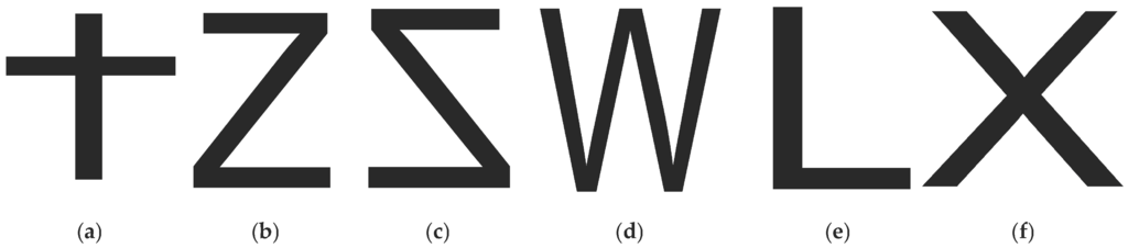 User security gestures and device selection gestures. (a) User 1 security gesture: drawing a cross shape in the air; (b) User 2 security gesture: drawing a Z shape in the air; (c) User 3 security gesture: drawing the inverse of a Z shape in the air; (d) Device 1 selection gesture: the user is asked to draw a W shape in the air; (e) Device 2 selection gesture: the user is asked to draw an L shape in the air; (f) Device 3 selection gesture: the user is asked to draw an X shape in the air.