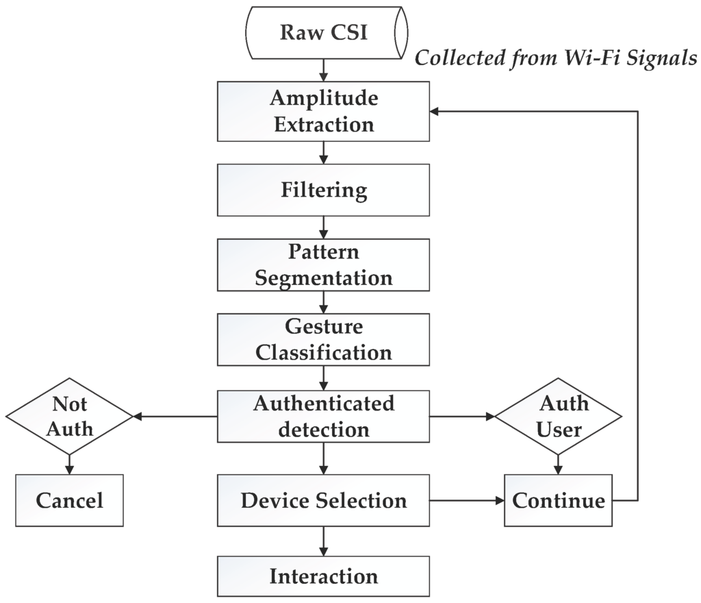 System Architecture and Workflow. WiFi-based gesture recognition system (WiGeR) starts by collecting channel state information (CSI) and then extracts amplitude information, removes noise, detects abnormal patterns, and classifies gestures. If the first gesture is classified as an authenticated user, the system will continue. Otherwise, the process will fail.