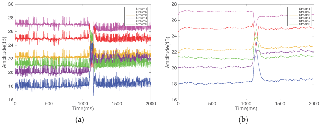 We aggregate the CSI in the 30 subcarriers into one single value , where i is the stream number. Thus, we acquire six streams that can represent CSI values, as shown in Figure 4.