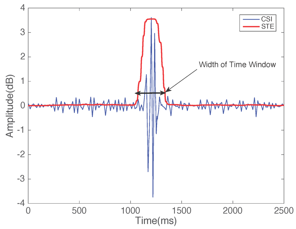 In Figure 6, the red line represents STE, which follows the CSI signal and increases as CSI varies because of human hand motion. The width of the time window can be seen clearly.