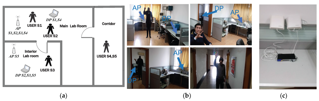 Experiments environment and setting. (a) Floor plan of experimental environment, setting and scenarios. S1 to S5 refer to the user’s location relative to the access point (AP) and detection point (DP) in scenarios 1–5; (b) Experimental environment and settings; (c) Two WB-2400D300 antennas.
