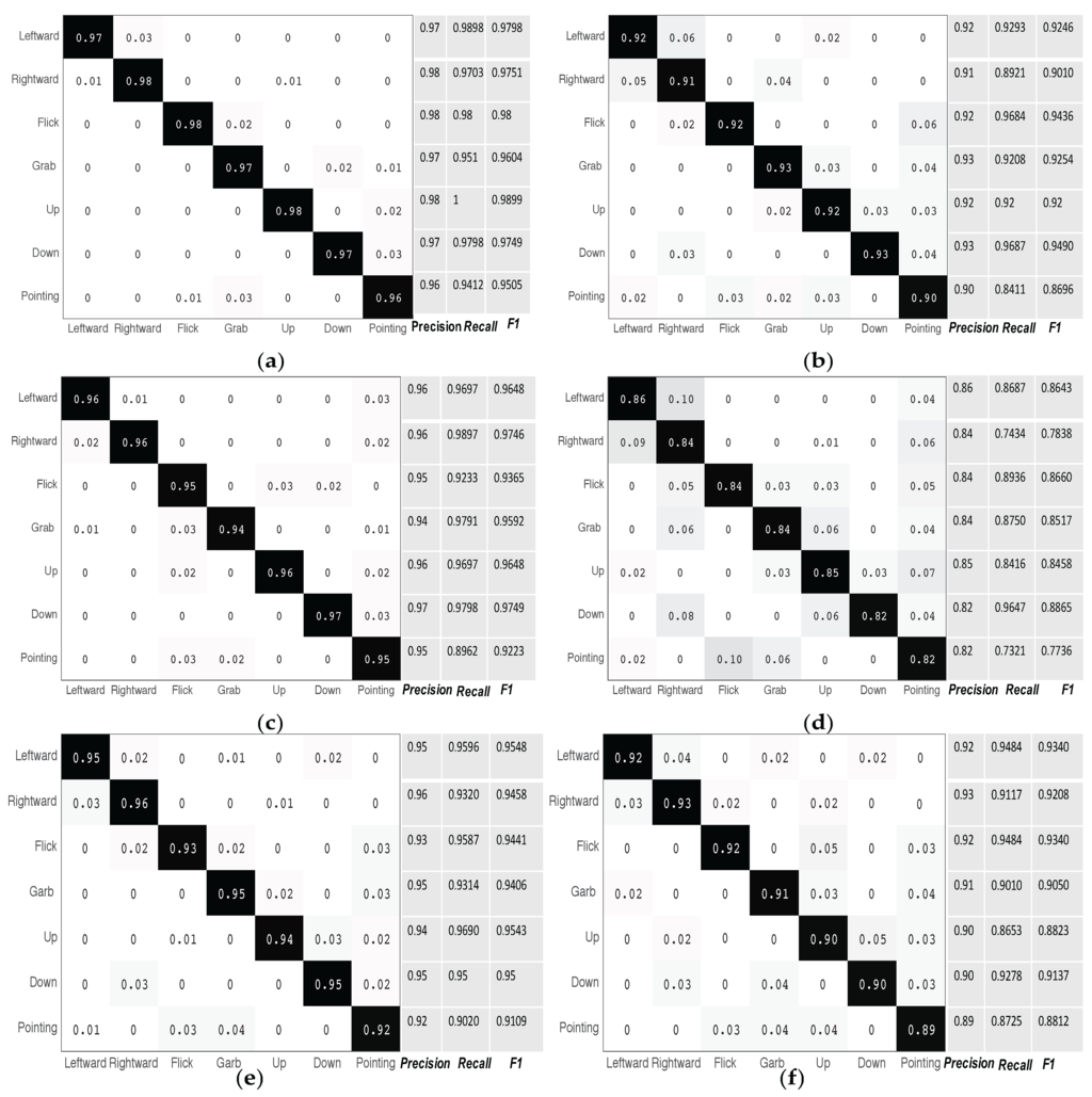 From Figure 9, we see the precision, recall, and F1 values of each gesture in each scenario. The achieved results of precision, recall, and F1 confirmed the efficacy of the proposed system.
