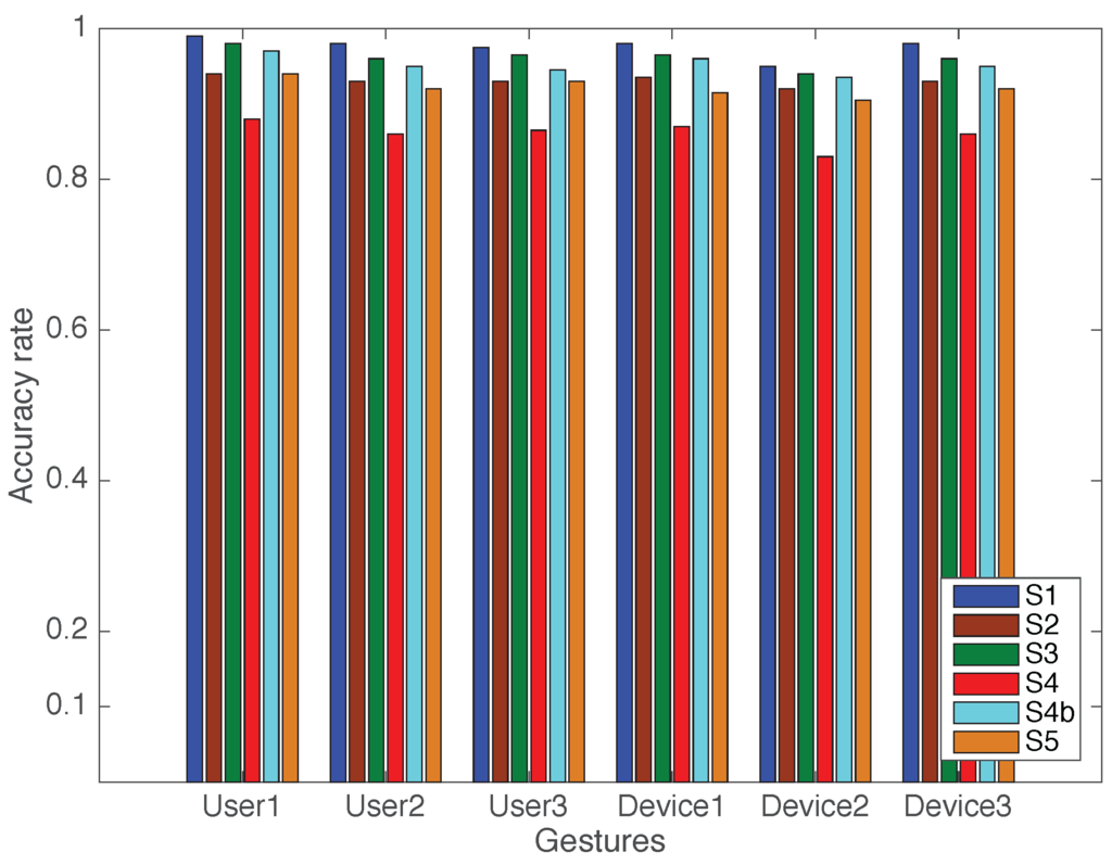The recognition accuracy rates for user security and device selection gestures in all scenarios. S1–S5 denote scenario 1 to scenario 5, S4b denotes scenario 4 with the added WB-2400D300.
