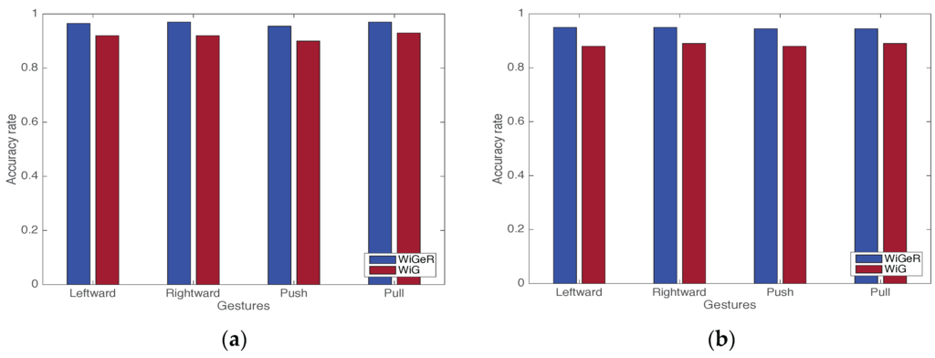 We experimentally compare WiGeR with WiG [31] to verify the advantages of our approach. We choose four gestures for the comparison: two gestures from the gestures proposed for WiGeR (leftward and rightward swipes) and two gestures from the gestures proposed by WiG (push and pull). We set up the AP and the DP the same as in the LOS and NLOS scenarios described in [31]. We collect data from one volunteer user in our lab room. For each scenario, 90 samples of each gesture are collected from this single user over 3 sessions. During each session, we collect 30 samples of each gesture. We use the methodology in WiG [31] to classify the gestures. Thereafter, we compare the results of WiG with the results of WiGeR. The comparison results show that WiGeR outperforms WiG in both LOS and NLOS scenarios, as shown in Figure 11.