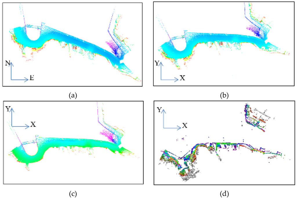 (a) Point cloud corresponding to slice 1 in Test Site 1 in UTM coordinate system; (b) after the coordinate system change; (c) filtering in negative; and (d) positive heights.