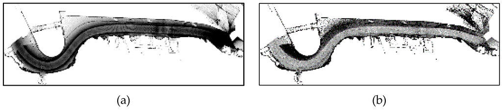 In this step, to simplify the analysis and reduce the computing cost of segmentation, the 3D point cloud is projected in a 2D grid that represents the XY surface, moving from a 3D cloud to a 2D raster image. Moreover, in a raster image, it is possible to apply image analysis techniques to detect those pixels that contain points that belong to a roadside. The efficiency of the detection process will depend on the pixel size of the created image. The cell size also depends on the point density of the point cloud: the higher the point cloud’s density, the higher the image resolution can be, but this can also require more computation resources. In any case, the grid spacing must be large enough to contain a significant number of points, but small enough to allow only a small number of salient features in each cell [25]. An empirical rule has been created to determine the optimum cell size of the grid for the rasterization of every point cloud. This rule depends on the distance between consecutive scans in the central part of the detected point cloud. Thus, the cell size must be between 4 and 5 times larger than the distance between consecutive scans. We have found that these values allow the proper detection of curbs with different scan densities and curb widths. For each pixel, two values are calculated and saved as digital values (DVs) in the grid: the difference between the highest and the lowest point of all points contained in the studied cell (resulting in an image similar to a normalized digital surface model (nDSM), and the number of points contained in every cell. Thus, the rasterization step provides two images: one with DVs representing the height difference between the highest and the lowest points (referred to as a nDSM from now on) and another in which each pixel’s DV is the number of points contained within it (referred to as image density from now on). Normally, the intensity of the laser reflected pulse is also available in MLS data, but we do not consider that information relevant for this work.