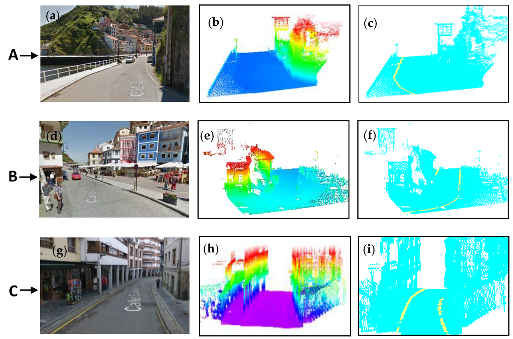 The outcome of the proposed method is shown in detail in Figure 13. The first row (detail A) represents a section of the street in which there is a curved curb and a sidewalk occluded by the shadow of a parked car. The proposed method correctly determines the curved section, but it is not possible to determine the curb in the occluded sidewalk due to the lack of information. Detail B (second row) is focused on a zebra crossing; in this road section, the method correctly determined the existing curbs but not the ramps to the zebra crossing due to the different height of these elements.