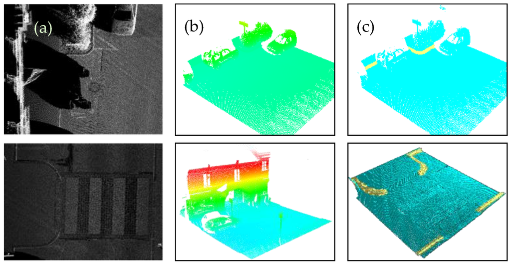 Details of Test Site 2. For each detail, a plan view of the intensity Lidar data (a), the original point cloud (b), and the result of the proposed method are shown with the curbs in yellow and the background in blue (c).