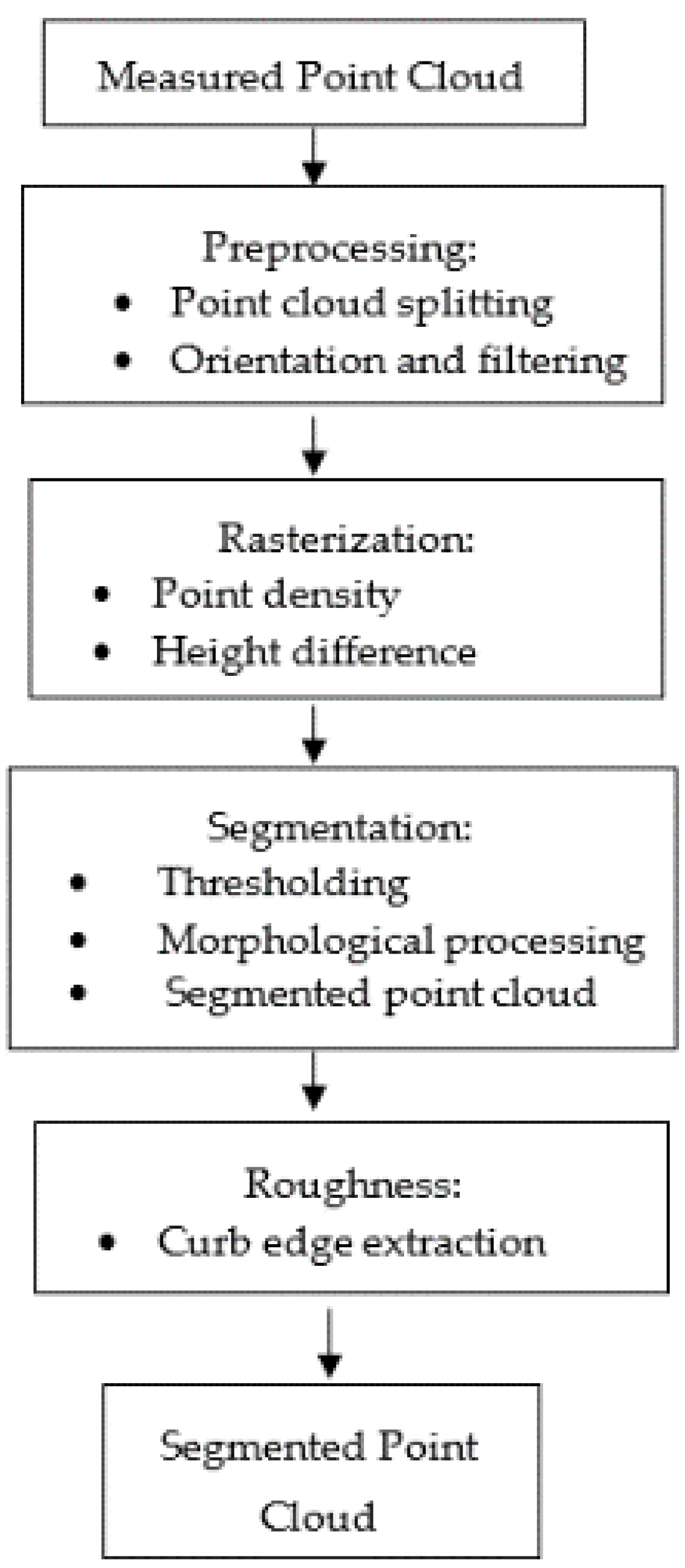 The method proposed in this work uses 3D point coordinates (x, y, z) of the cloud data measured by MLS as inputs. The output of the procedure is a new 3D point cloud formed by those points that belong to a curb. The proposed method for segmenting MLS data consists of four consecutive steps, as shown in Figure 1.