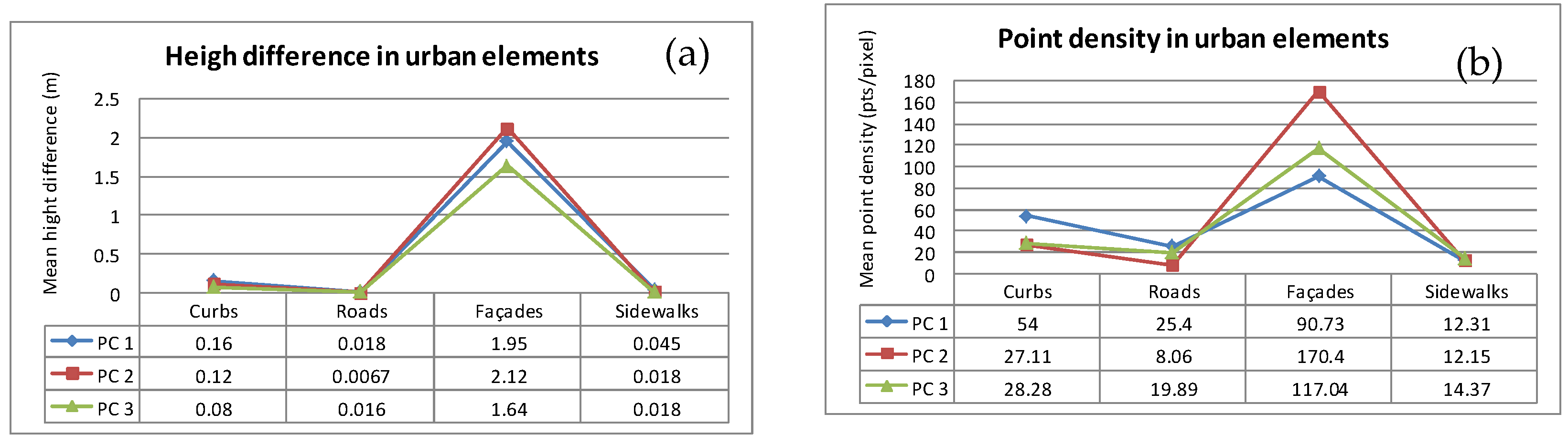 Height difference (a) and mean point density (b) of four urban elements in three different point clouds (PC).