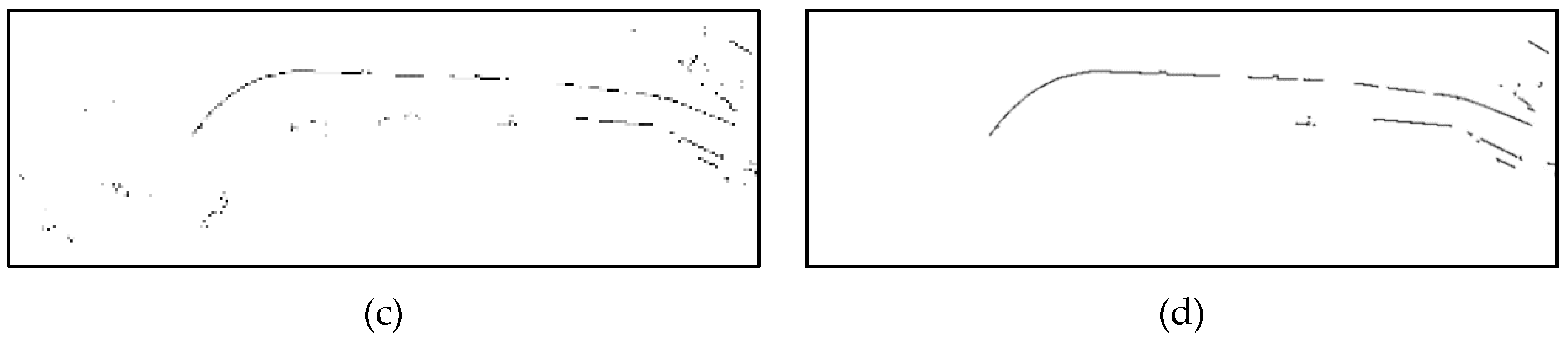 A morphological opening operator [31] is applied over the binary image to remove those groups of pixels that do not represent a curb. In the dilation operation, every pixel that is connected with the candidate pixels of the binary image is added to the set of curb candidate pixels. This morphological operation is applied in a 3 × 3 window. The results of every step of the method can be seen in Figure 5.