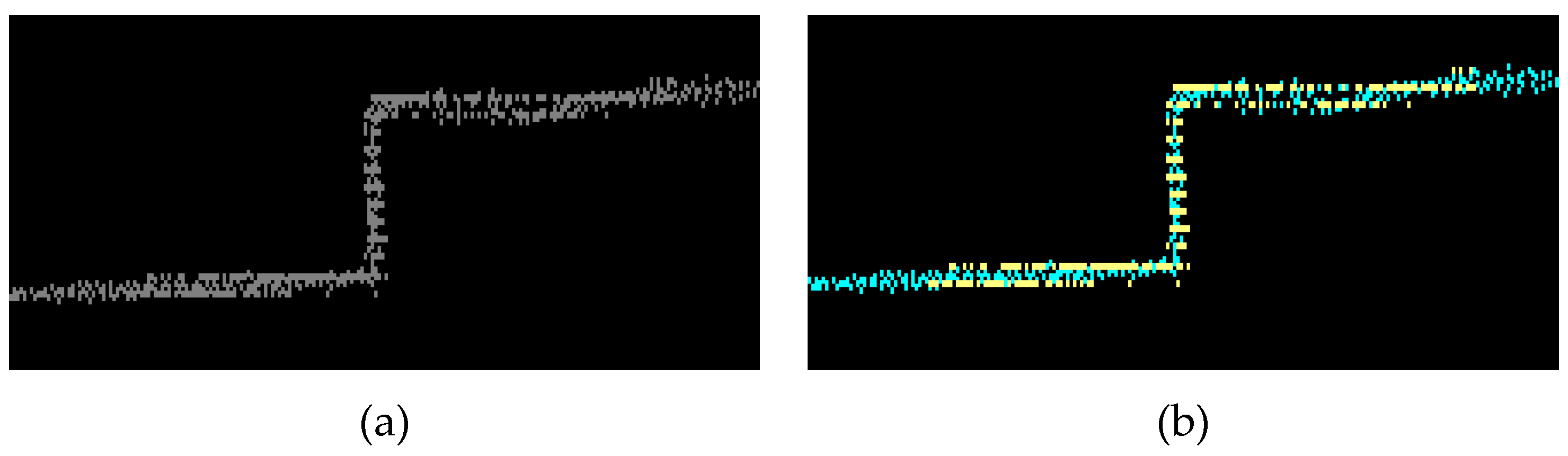 (a) Profile of a curb in the measured point cloud and (b) the segmented curb, with the detected curb in yellow and the background points in blue.