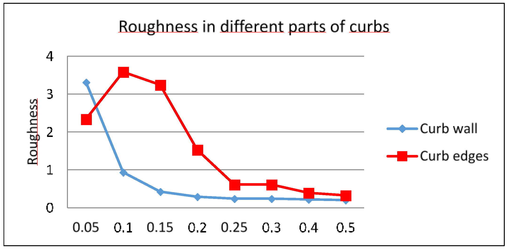 Roughness values in curb walls and curb edges (vertical axis) for different neighborhood sizes (horizontal axis, in cm).