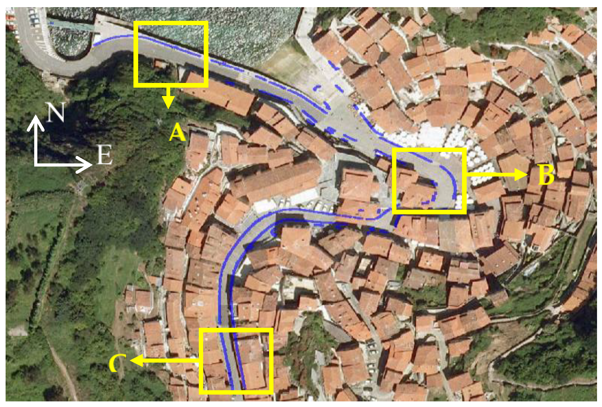 The point cloud from Test Site 1 was measured in Cudillero, a town in the north of Spain. This is a typical fishing village with low houses, very narrow streets, sometimes only one-way, and very tight sidewalks. This point cloud covers a 400-m street with both straight and curved sections (Figure 9).
