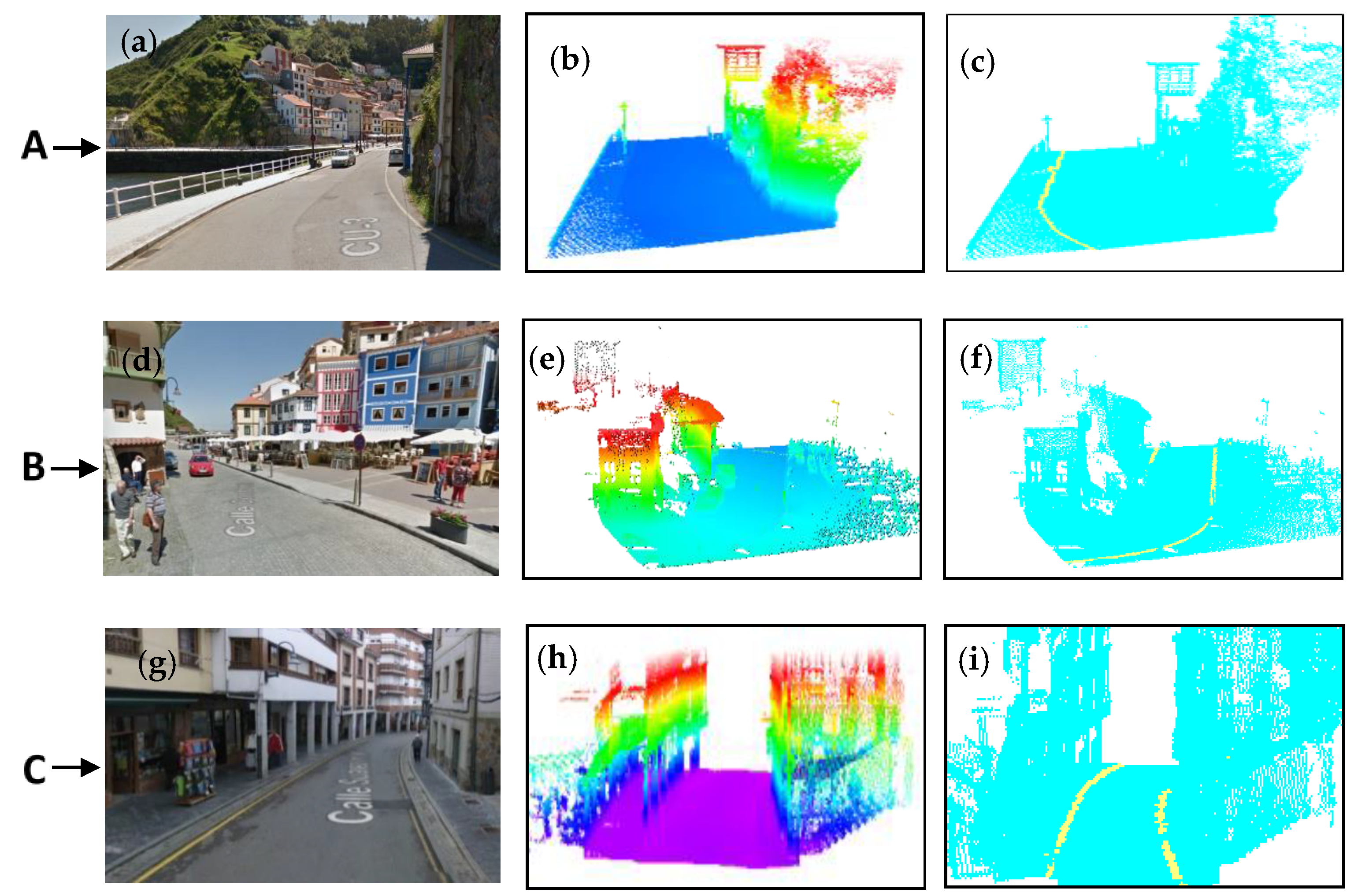 (a–i)Three detailed views (A, B and C) of Test Site 1. The first column shows the street-level imagery (Figure 10a,d,g). The second column represent the original registered point cloud (Figure 10b,e,h). The results of the detection developed method are shown in the third column (Figure 10c,f,i).