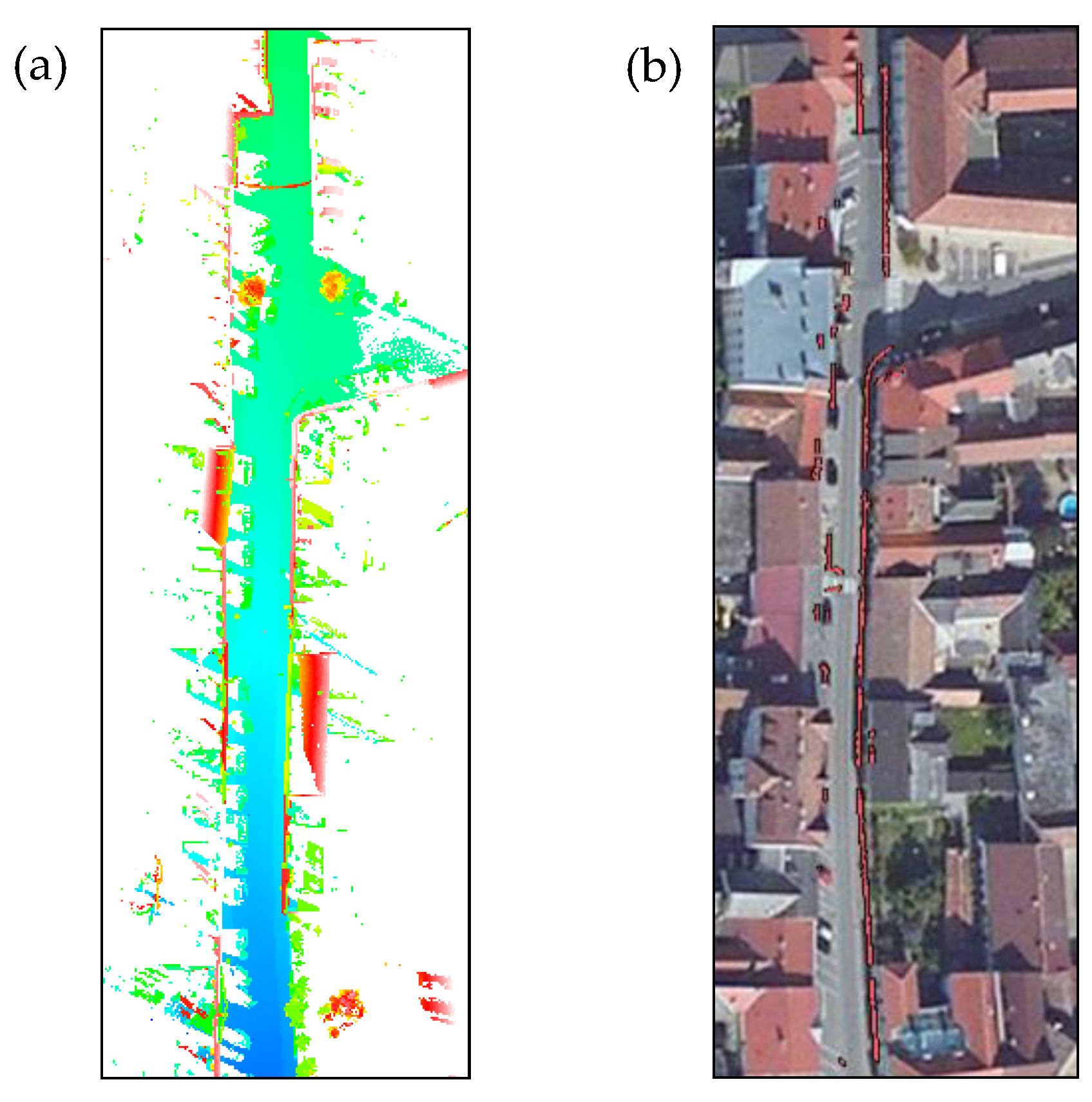 Point cloud measured by a RIEGL sensor used as Test Site 2 (a). Ortho-image of the studied area overlapped by segmented curbs (b).