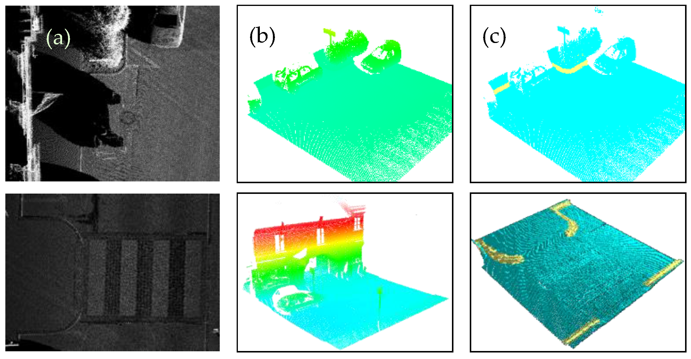 Details of Test Site 2. For each detail, a plan view of the intensity Lidar data (a), the original point cloud (b), and the result of the proposed method are shown with the curbs in yellow and the background in blue (c).