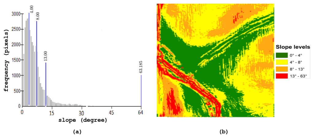 (a) Statistical analysis of elevation data for the terrain; (b) slope map consisting of four slope ranges.