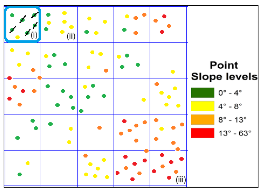 In our LiDAR data reduction algorithm, initially, we overlay a grid of 1 sq.m. cells on the LiDAR data, by preserving the spatial geo-referencing. Select the first cell in the grid, and choose a LiDAR point randomly from all of the LiDAR points that lie in that grid cell. We keep on selecting different random LiDAR points from the selected cell, until we get a LiDAR point that lies in the region or until all of the LiDAR points are checked. If we find a LiDAR point lying in the region, we check whether (user input) of the LiDAR points in that cell belongs to the region or not. If it does, then we remove all of the points in that cell that belong to the region, except the chosen point (ex. Cell (i) in Figure 3, with ). If we do not find any LiDAR point lying in the region, we check for LiDAR points lying in the region (ex. Cell (ii) in Figure 3) and do the same as above. If we do not find any LiDAR points lying in regions or or there is no removal of points in the cell (ex. there will not be any data removal in Cell (iii)), we simply proceed to the next cell in the grid. We repeat the above steps until we have processed all of the cells in the grid, starting in a left-right, top-bottom fashion. The motivation behind this LiDAR data reduction algorithm is the fact that we do not need too many LiDAR points to represent a flat terrain as compared to an irregular terrain.