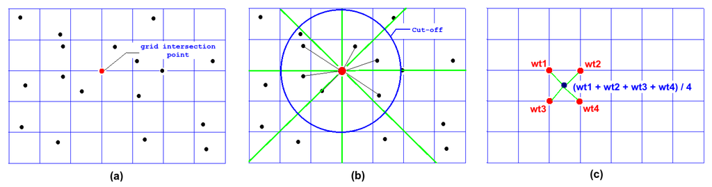 Figure 8. (a) Grid of k sq. m. () overlaid on the LiDAR data; (b) selecting cut-off radii and assigning weights to grid intersections; (c) assigning weights to each grid cell. - For each intersection point, we compute and assign a weight as follows: