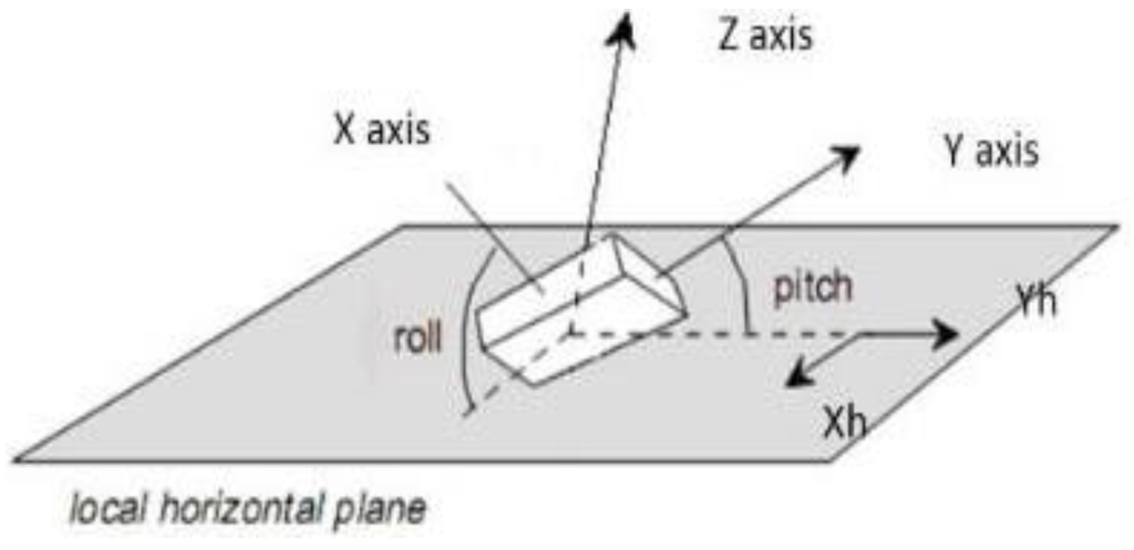 The heading is calculated by magnetic compass through measuring the horizontal component of the geomagnetic field. When the platform is tilted, the vertical component of the geomagnetic field will be projected to the induction axis of the compass, which will cause large deflection error. Therefore, platform tilt error modeling aims to achieve rotation from horizontal coordinate system to platform coordinate system: