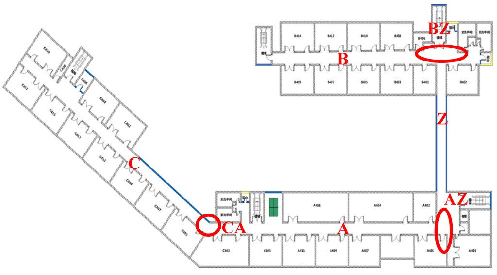 As shown in Figure 3, the three regions marked with red circles are non-linear regions, namely BZ, AZ and CA. Within such regions, users generally turn to walk or move around. In the three linear regions labeled as C, B and A in the corridor, users usually walk in a straight line.
