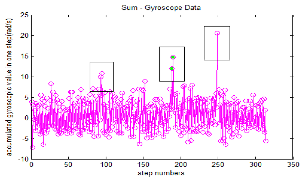 and refer to the cumulative values of gyro for the current step and previous step, respectively. Figure 4 shows the cumulated value of the gyro corresponding to each step during the movement. The three extreme points within rectangular boxes represent three turning movements, as shown in Figure 5. Therefore, when the accumulated value of the gyro does not meet formula (7), the user can be basically identified as walking in a straight line.