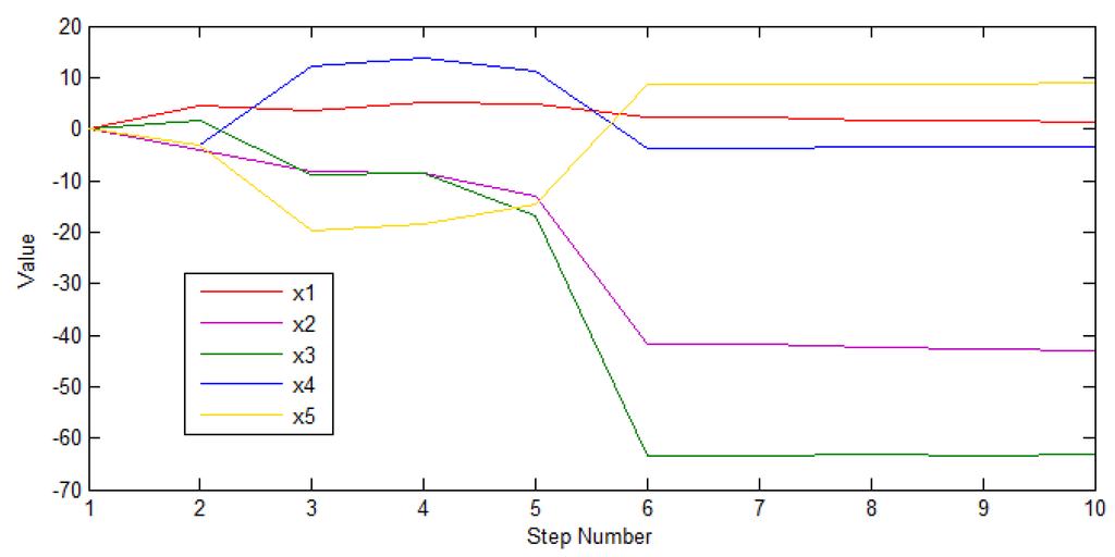 P is set based on the experience. It is generally set to be a large value, so as to guarantee the algorithm convergence. In this paper, it is set to be a matrix with the initial value of 1000 for 5 × 5 diagonal elements. As can be seen from Figure 6, the diagonal element value of P decreases rapidly and then tends to be stable for the first 5 steps. It corresponds to the elements of state vector X in Figure 7, namely change between two adjacent states is relatively small after 5 steps.