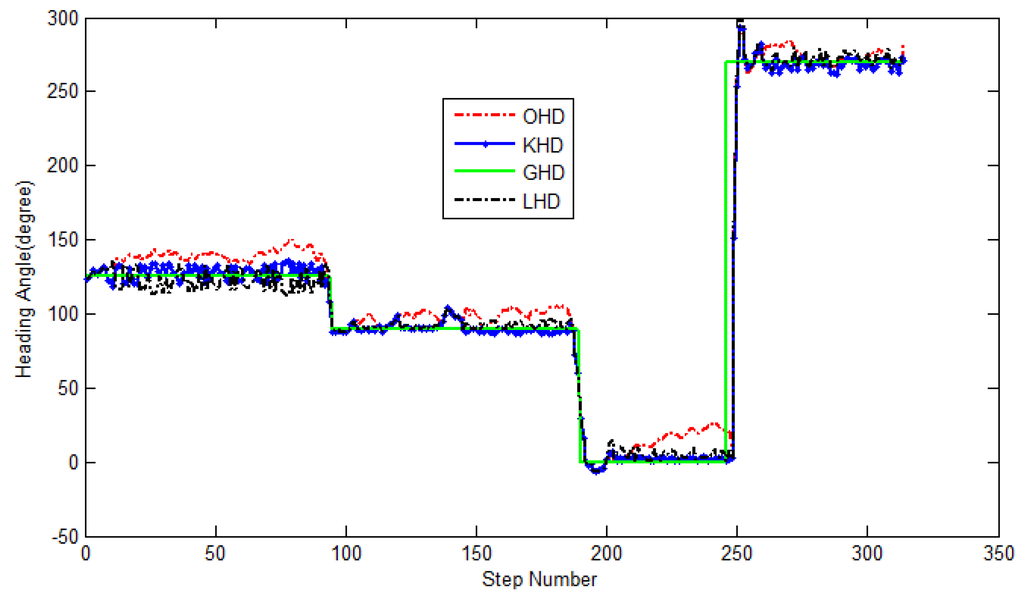 The four direction calculation methods are compared: in the first method, the direction value is acquired by original direction sensor of mobile phone, denoted as OHD; in the second method, the direction error is restricted by map matching, denoted as GHD; in the third method, real-time compensation is made for direction error based on the least squares algorithm, denoted as LHD; in the fourth method, real-time compensation is made for direction error based on Kalman filtering algorithm, denoted by KHD.