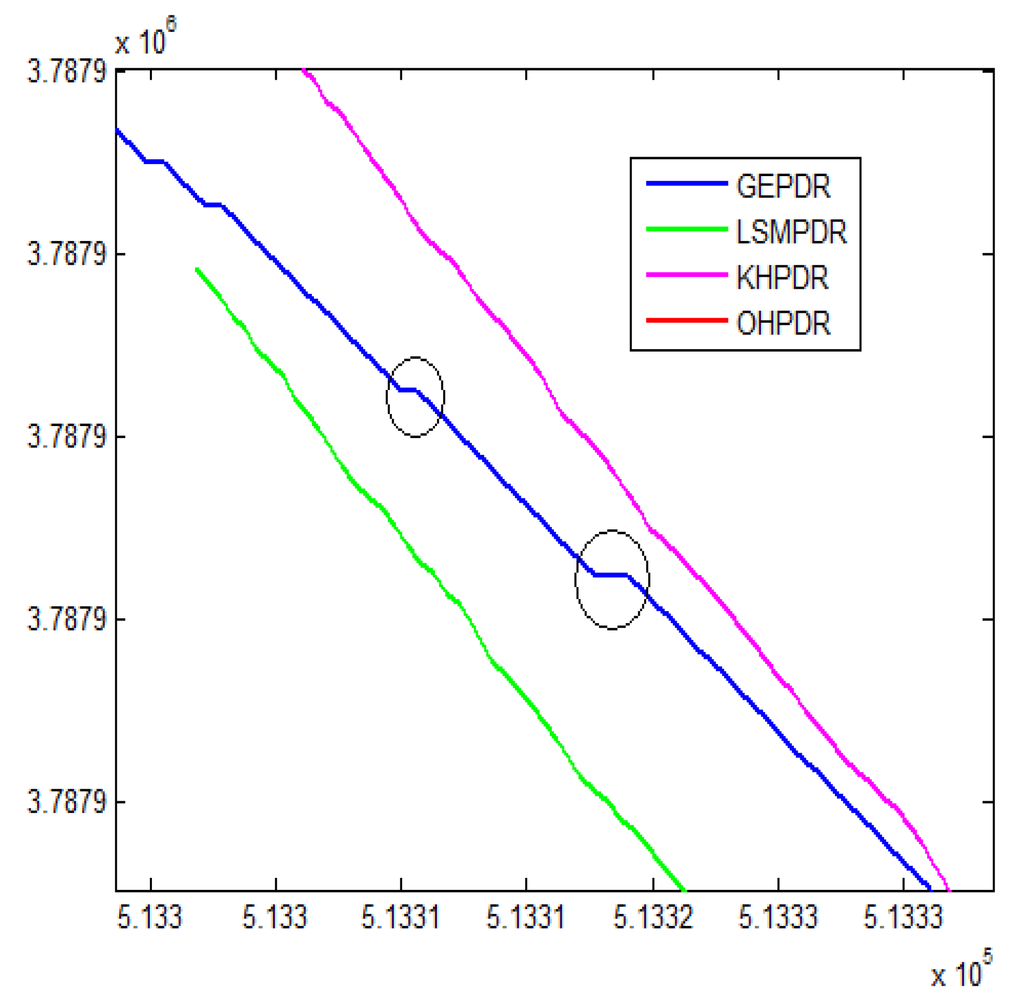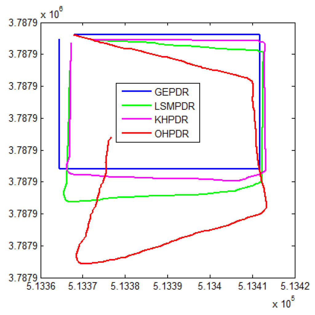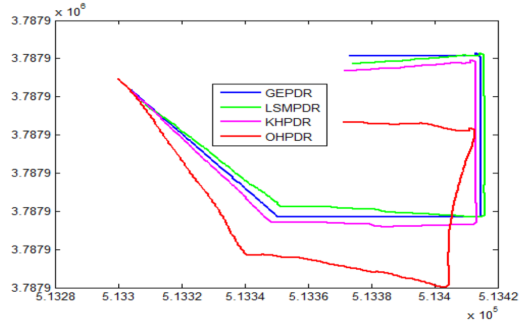 As shown in Figure 14, the trajectory of algorithm OHPDR held maximum deviation from the true value because any optimization was not conducted in the direction. Algorithm GEPDR held relatively smooth trajectory, but had large whole deviation; especially at the corner, the true circle was bound into a small rectangle. Algorithm KHPDR was the most close to the true trajectory and algorithm LSMPDR was slightly inferior in algorithm KHPDR.