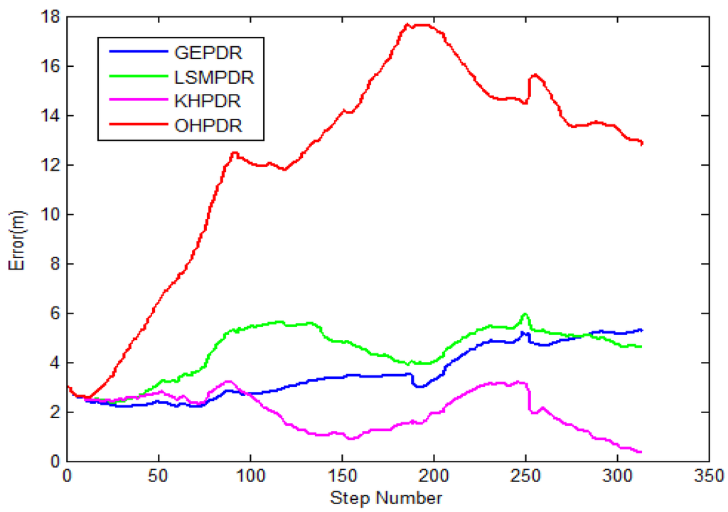 The trajectory of OHPDR is in red, as shown in Figure 9. Within the range of the first 200 steps or so, the error has been accumulated from the initial 2.56 m to 22.67 m. Subsequently, the error is slightly decreased, but the mean error reaches 12.03 m. Because of the heading error, this solution completely deviates from the true trajectory.