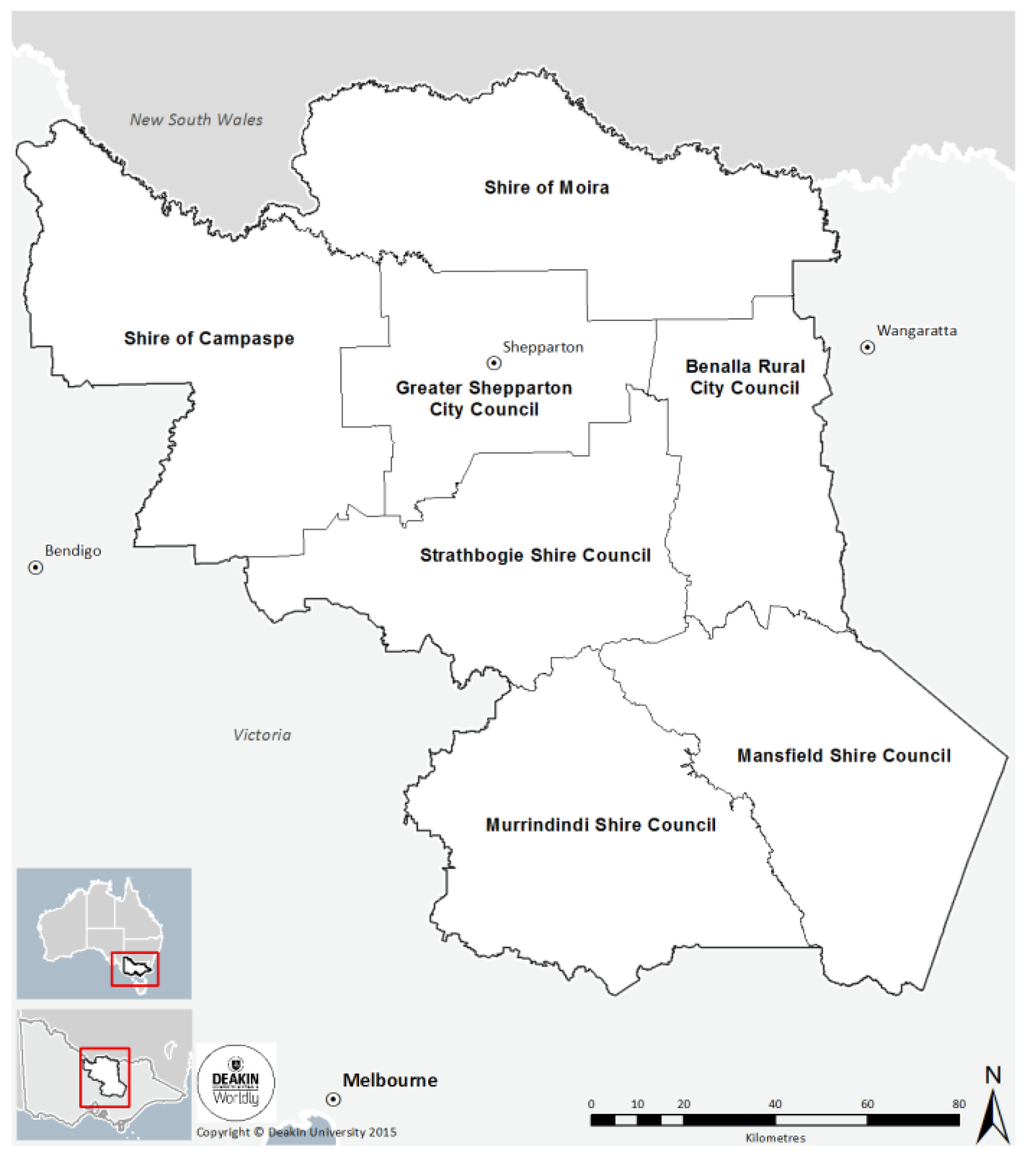The area of focus for this analysis is centred upon the Goulburn Broken Region of the state of Victoria in Australia (Figure 1). The defined geographic area for the study comprises of the boundary extent for seven Local Government Areas; Moira, Shepparton, Benalla, Campaspe, Murrindindi and Mansfield. Hereafter, this area will be referred to as the Study Region. The region is located to the north of the state capital, Melbourne. It is bordered to the south by the Great Dividing Range and to the north by the Murray River and the state of New South Wales. It has an area of approximately 24,000 km2 (2.4 million hectares) and has a mixture of land uses within its boundaries. The dominant amongst these uses is land turned over for agricultural production including dryland and irrigated agriculture, which account for almost two thirds of the area in the Study Region. The largest agricultural enterprise, in terms of area, in the Study Region are pasture systems set aside for dairy and beef cattle and other pasture based livestock. However, the predominant industry, in terms of gross revenue, is horticultural production, which includes stone fruit and pome fruit. Pear production in this region alone accounts for over 85% of Australian output.