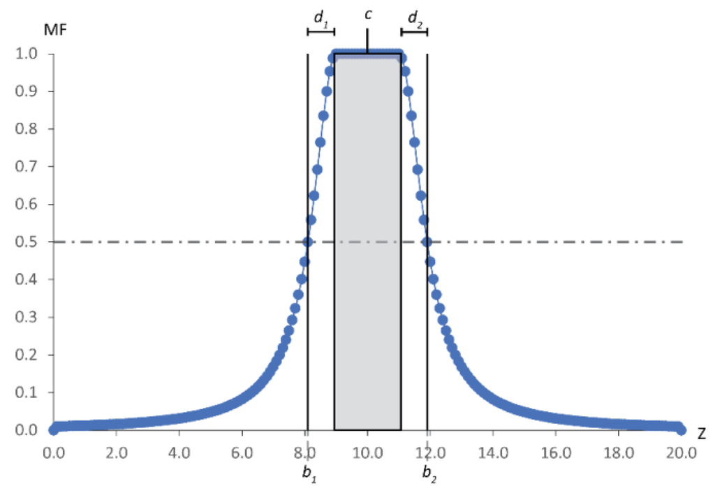 In this Membership Function (MF), the behaviour of the positive and negative sinusoidal curves are set by the parameters and , which control the width and the transitional point of the curve where MF = 0.5. This model is defined by three equations: