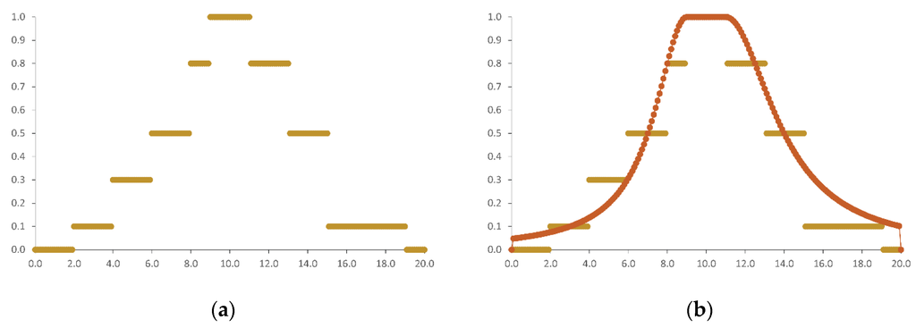(a) Membership function representation of a Standard Boolean Analytical Hierarchy Process framework; (b) A sinusoidal membership function that is fitted to an AHP membership function—Fitted Fuzzy Curve.