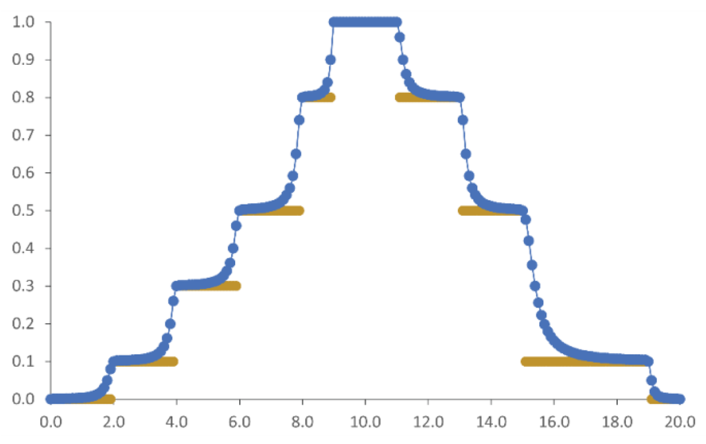 Multiple sinusoidal membership functions fitted within an AHP membership function—Nested Fuzzy AHP.