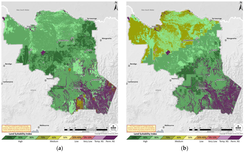 General trends for each method indicate that between the climate normal baseline and 2050 there is an overall decline in suitability ratings, but the higher proportions always remain within the 90% suitability index value. Also of note is that the values for the TNS and PNS index values remain the same. However, from the Standard AHP and fuzzy set models, for these non-suitable classes, there is a reduction in the total occupied area in the Study Region. The differences between each modelling method can be discerned from these numerical outputs, in particular between the Standard AHP and the Fitted Fuzzy model.