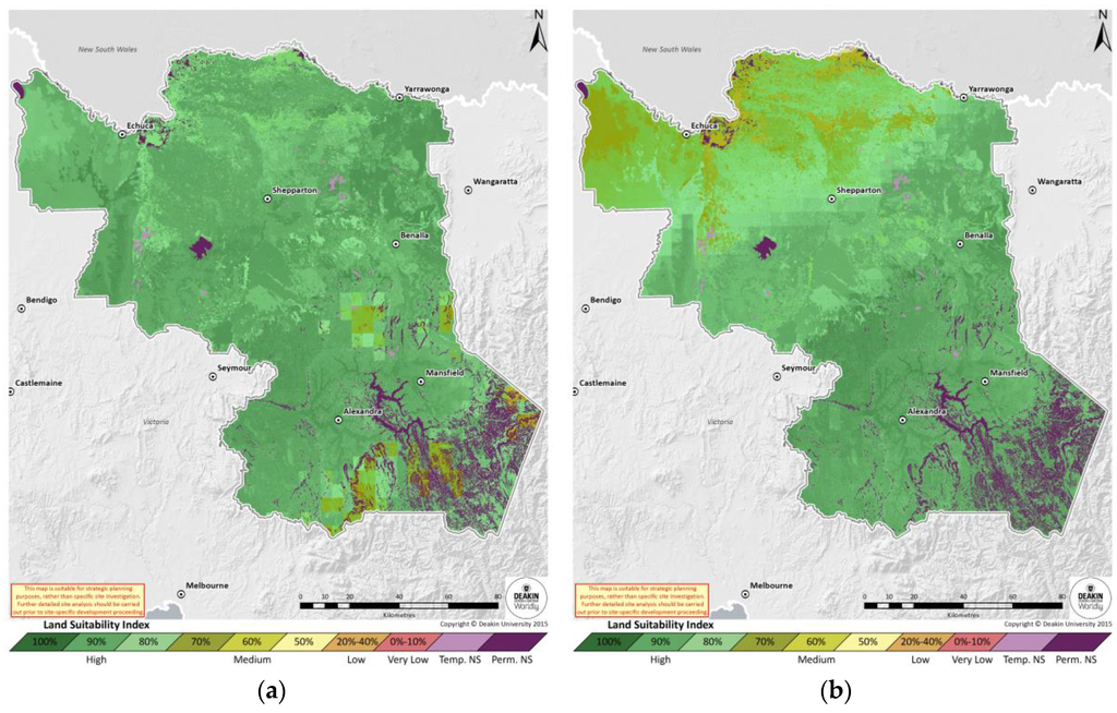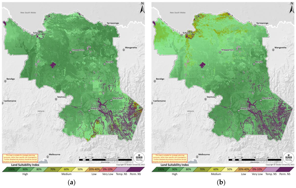 The two panels in Figure 6 are fuzzy set modelling outputs in which the sinusoidal membership function curve is fitted to the determined values within the AHP, as depicted in Figure 3. These two panels represent outputs for the climate normal baseline year (left panel) and the year 2050 (right panel). Suitability index values, i.e., membership function values, in the Standard AHP approach are presented as being as being in distinct classes. In comparison with this, the suitability index values in the fuzzy set models are continuous. Hence, the spatial outputs can be depicted with a gradated colour schema, similar to that in the Standard AHP spatial outputs, but more reflecting the complex modelling values.