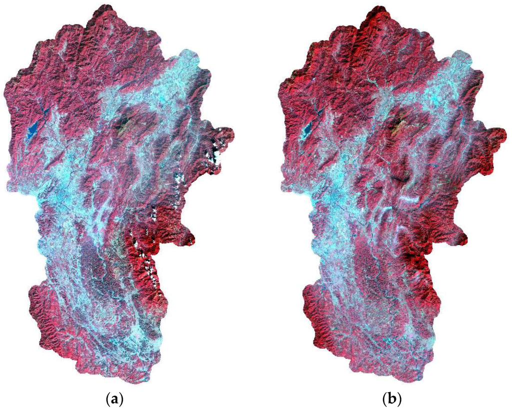 False color composite image of Lijiang River Basin: (a) 2009; (b) 2013.