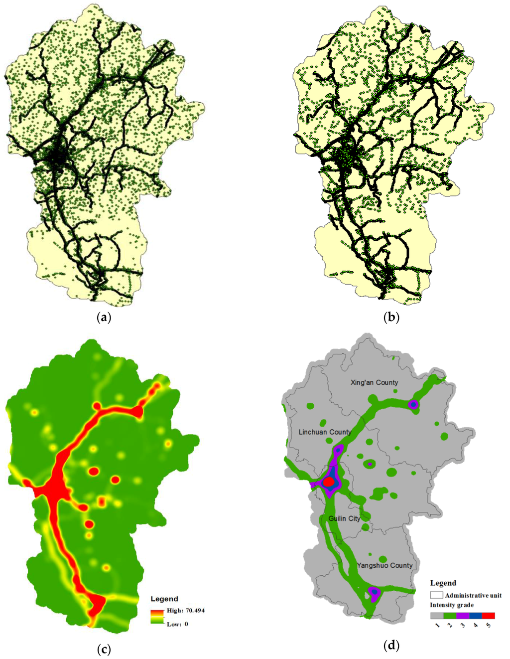 Human activity analysis in Lijiang River Basin. (a) Raw GPS trajectories; (b) GPS trajectories after preprocessing; (c) intensity distribution; (d) intensity grade.