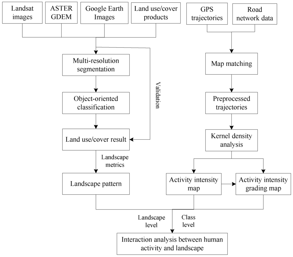 The overall workflow is composed of three steps, as shown in Figure 4: landscape pattern calculation, activity intensity calculation and interaction analysis. Four datasets (Landsat images, ASTER GDEM, Google Earth images, land use/cover products) are used in the first step, and they are split into two parts: one part for classification model training and another for validation. The land use/cover result is generated through the object-oriented image classification method and further used to derive landscape pattern status based on a group of selected landscape metrics. In the second step, we first conduct map matching between raw GPS trajectories and road networks to filter out noisy GPS points. We then use the kernel density estimation method to calculate the spatial distribution of activity intensity and further obtain its grading map by an established grading standard. Finally, based on the above three results, we conduct correlation analysis at both the landscape level and class level to explore the interaction characteristics between these two components.