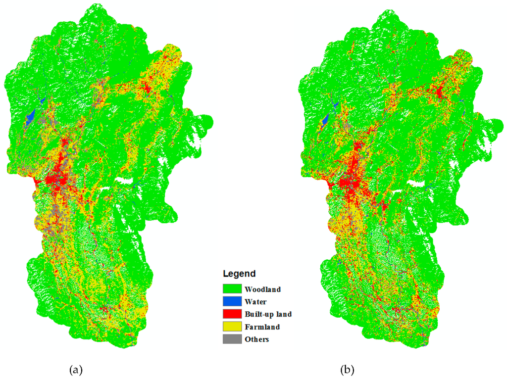 Land use/cover in Lijiang River Basin: (a) 2009; (b) 2013.