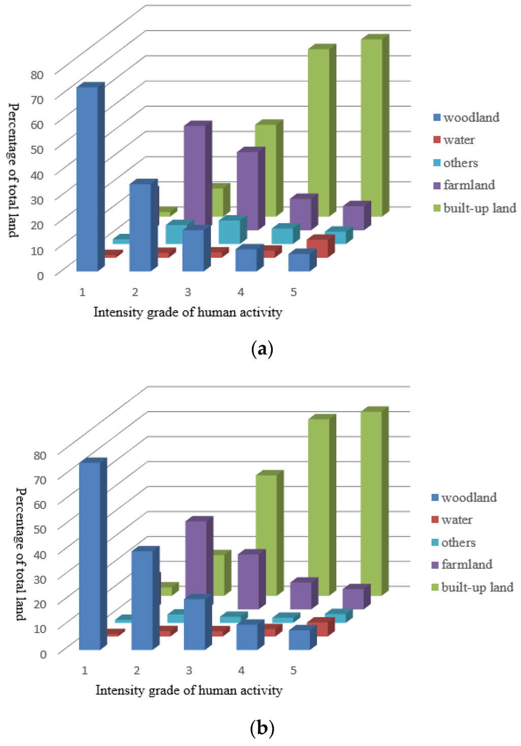 Land percentage for different intensity grades of human activity: (a) 2009; (b) 2013.