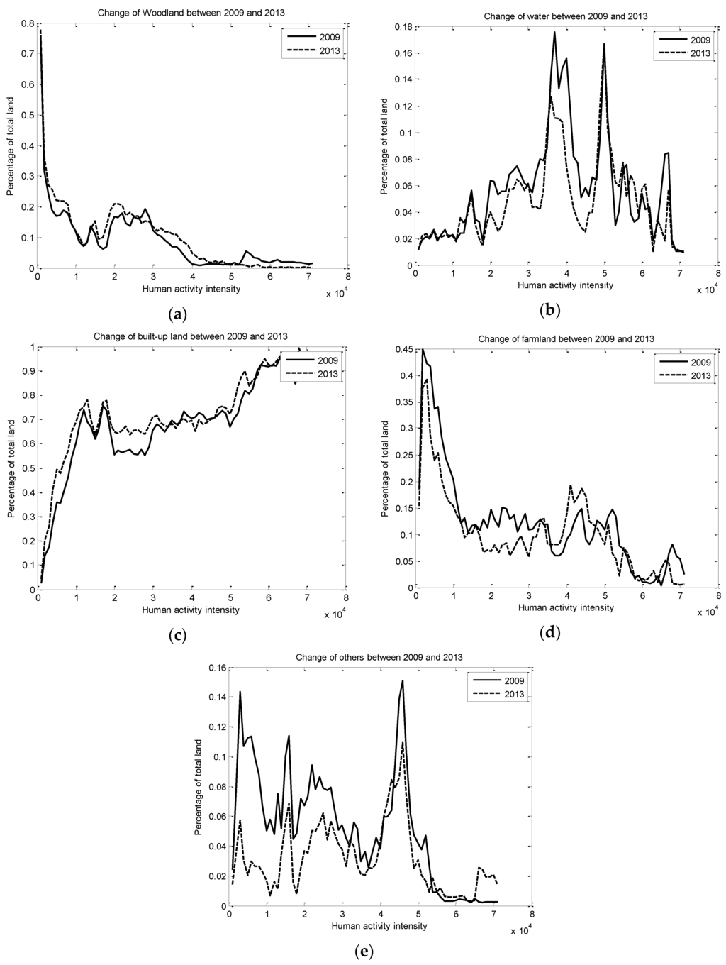 Change of land percentage with human activity intensity between 2009 and 2013. (a) Woodland; (b) water; (c) built-up land; (d) farmland; (e) others.